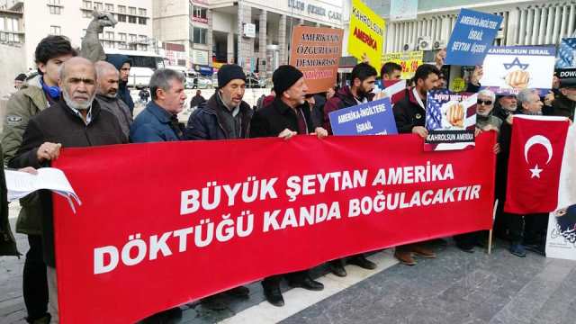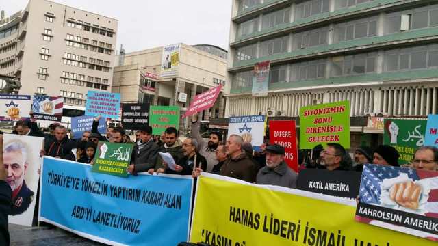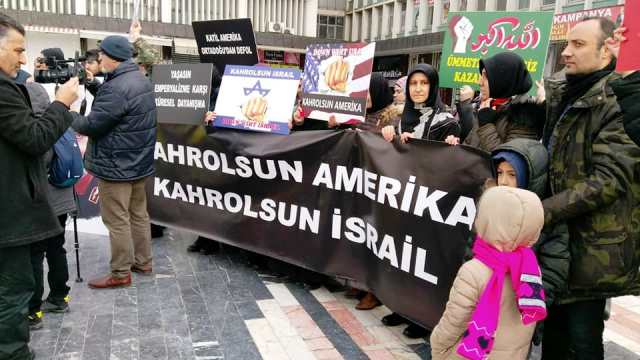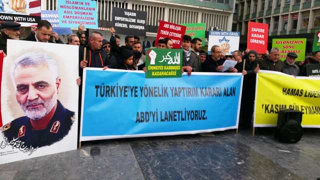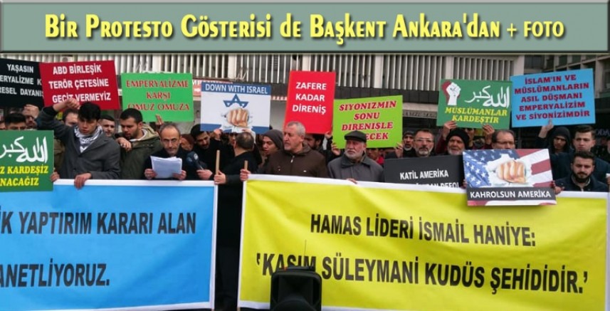 Çevre illerden müminlerin de katıldığı eylemde, 'Kahrolsun ABD! Kahrolsun İsrail!', 'Siyonist Trump Hesap Verecek!', 'Terörist NATO Türkiye'den Defol', 'Kudüs'ün Şehidi Süleymanî', 'Direniş Ekseni Onurumuzdur', 'Denizden Nehire Özgür Filistin', 'Kudüs'e Selam Direnişe Devam' ve 'Biz Biriz Ümmetiz Kardeşiz' sloganları eşliğinde basın açıklamasını Kudusgunu.com yayın yönetmeni Kemal Kemahlı okudu.