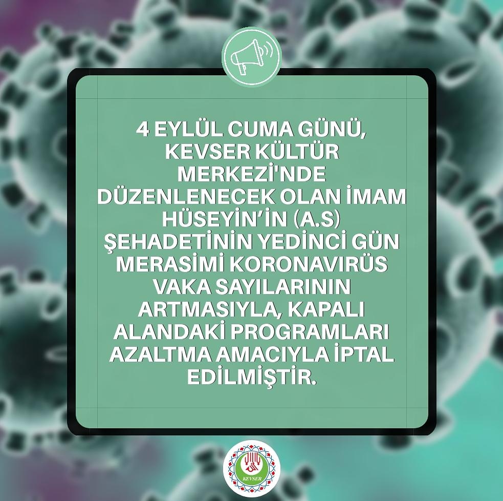 4 Eylül Cuma günü, Kevser Kültür Merkezi'nde düzenlenecek olan İMAM HÜSEYİN’İN (a.s) ŞEHADETİNİN YEDİNCİ GÜN MERASİMİNİN İPTALİ